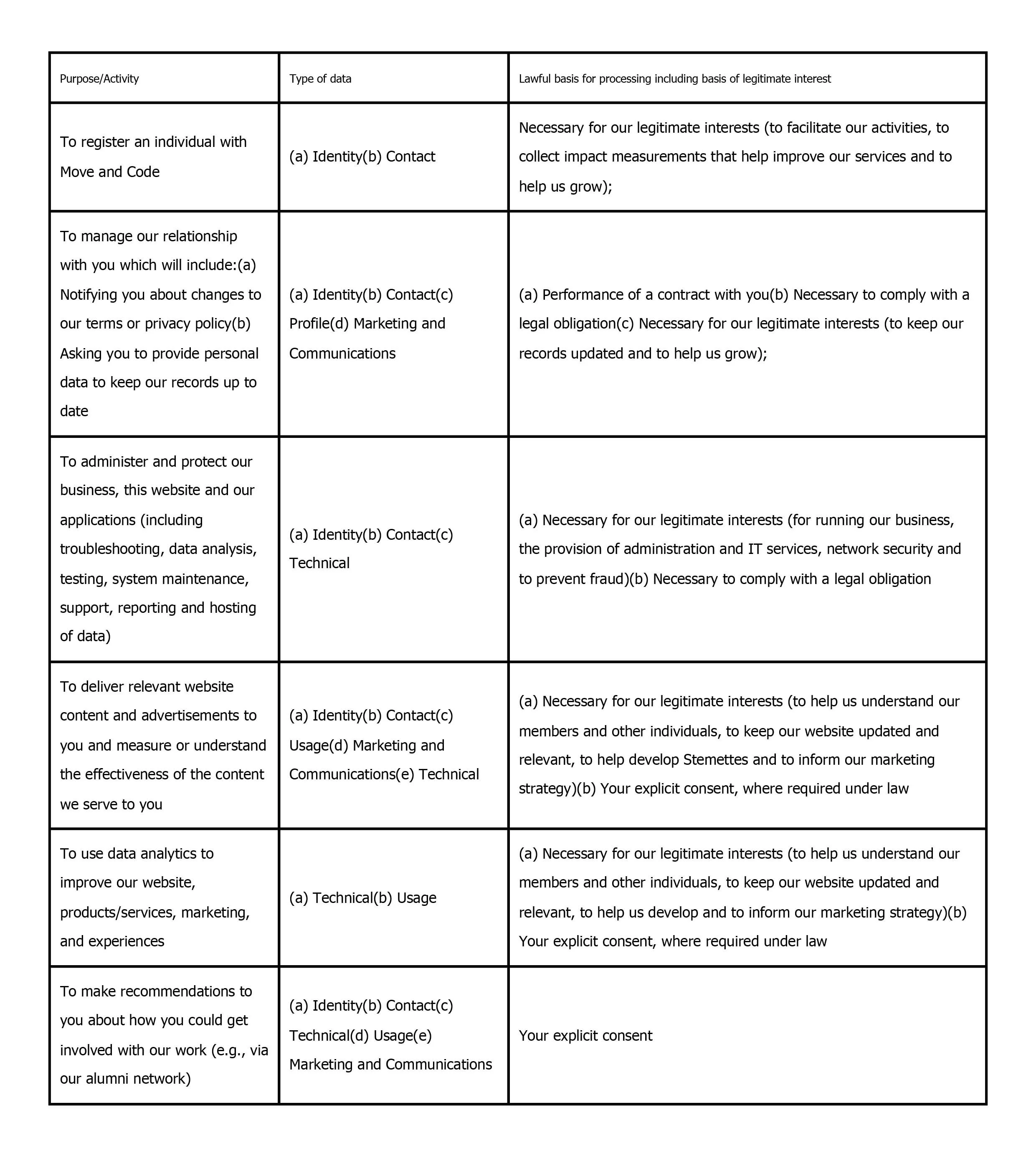 You should know that we may process your personal data for more than one of these reasons, depending on what we are using your personal data for. Please contact us at hello@moveandcode if you need more details about which lawful basis we are relying on to process your personal data, where more than one reason has been set out in the table below.